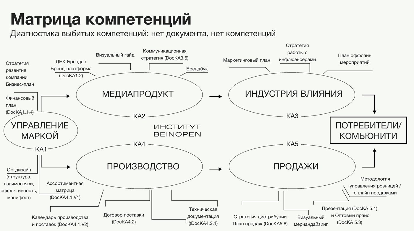 Что значит «отлаженный бизнес» и «сложная система»? В успешных брендах, командах и у основателей есть определённый набор компетенций. На их основе мы разработали матрицу компетенций — инструмент, который позволяет определить, каких именно элементов не хватает вашему бренду для роста. Например, навыков в области производства, дистрибуции или коммуникации.