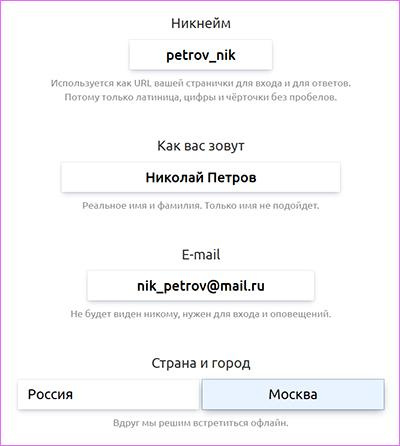 - Далее заполняете анкету. Обязательно пишите свои полные имя и фамилию по-русски, иначе модератор вас не пропустит.