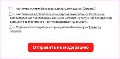- Затем проставьте 3 галочки и отправьте вашу анкету на модерацию. В течение дня вашу заявку примут, и вы сможете заходить на платформу