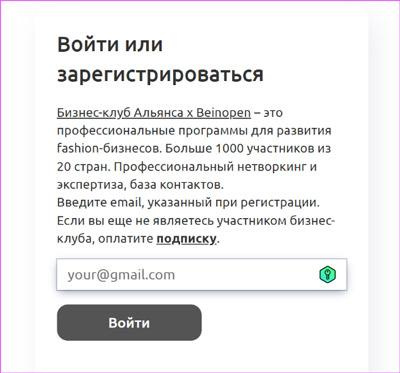 В течение суток на вашу почту придет письмо с приглашением вступить в бизнес-клуб Альянса х Beinopen. Пройдите по кнопке из письма «Зарегистрироваться в клубе».