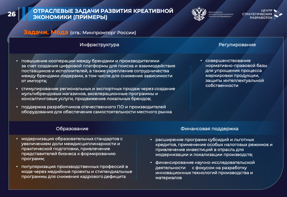 В рамках сбора отраслевых предложений по корректировке проекта https://www.economy.gov.ru/material/departments/d04/kreativnaya_ekonomika/proekt_strategii_razvitiya_kreativnoy_ekonomiki_v_rossiyskoy_federacii_do_2036_goda.html вносим свои предлодения.