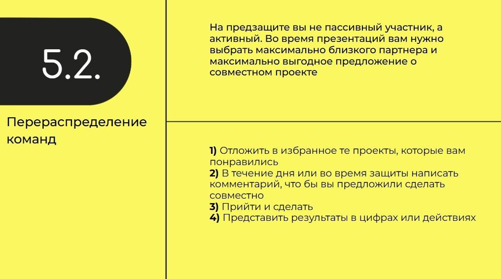 На предзащите вы не пассивный участник, а активный. Во время презентаций вам нужно выбрать максимально близкого партнера и максимально выгодное предложение о совместном проекте: