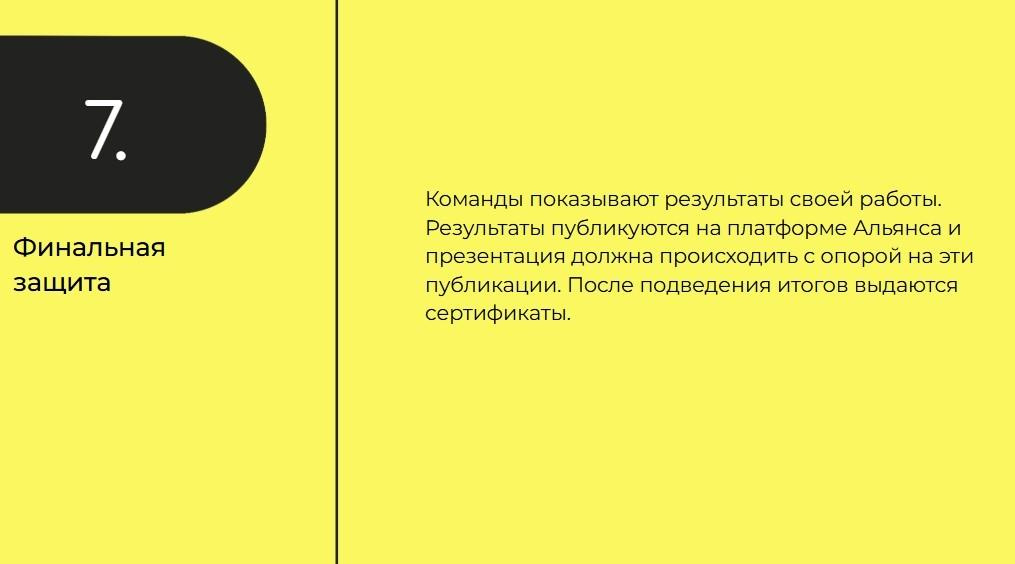 Команды показывают результаты своей работы. Результаты публикуются на платформе Альянса и презентация должна происходить с опорой на эти публикации. Цифры и скриншоты результатов можно добавлять в комментарии к проектам или можно написать пост на платформе «Мои результаты: что получилось и что нет» и показать там кейсы последнего месяца.