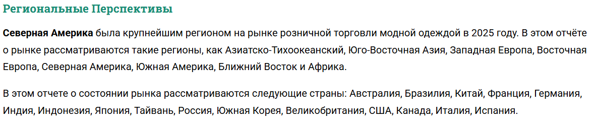 По данным на 2025 год, размер глобального рынка fashion-ретейла составил 99,31 млрд долларов. Ожидается, что к 2030 году этот показатель достигнет 142,03 млрд долларов, при этом ежегодный темп роста составит 7,4%
