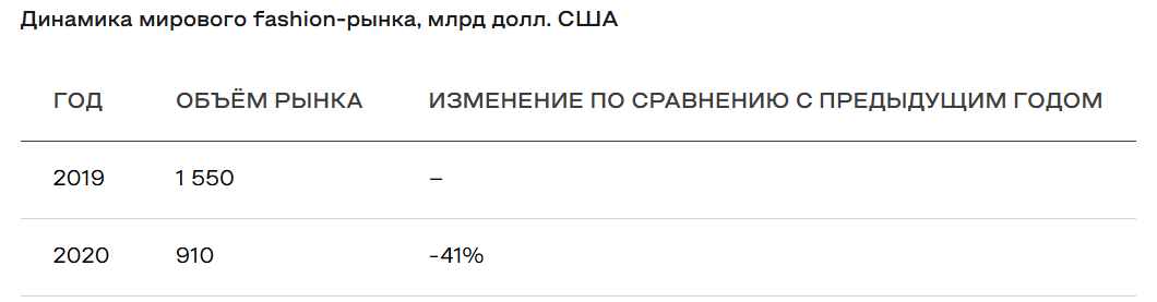 Пандемия COVID-19. Согласно отчёту Business of Fashion и McKinsey & Company, отрасль потеряла около $640 миллиардов в 2020 году. Объём мирового рынка моды резко упал.