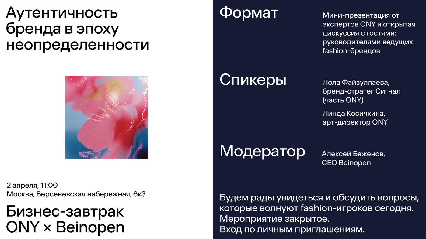 Формат встречи — мини-лекции от экспертов ONY и открытая дискуссия с гостями: руководителями ведущих российских fashion-брендов.