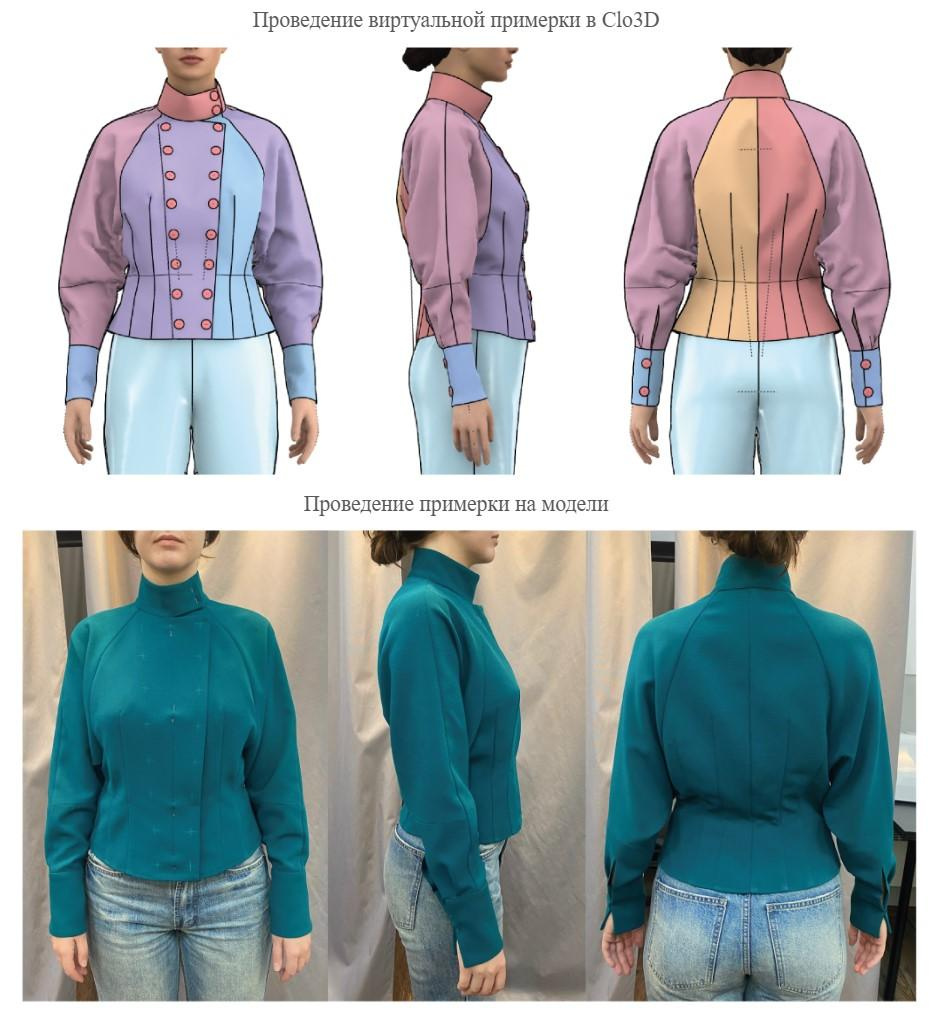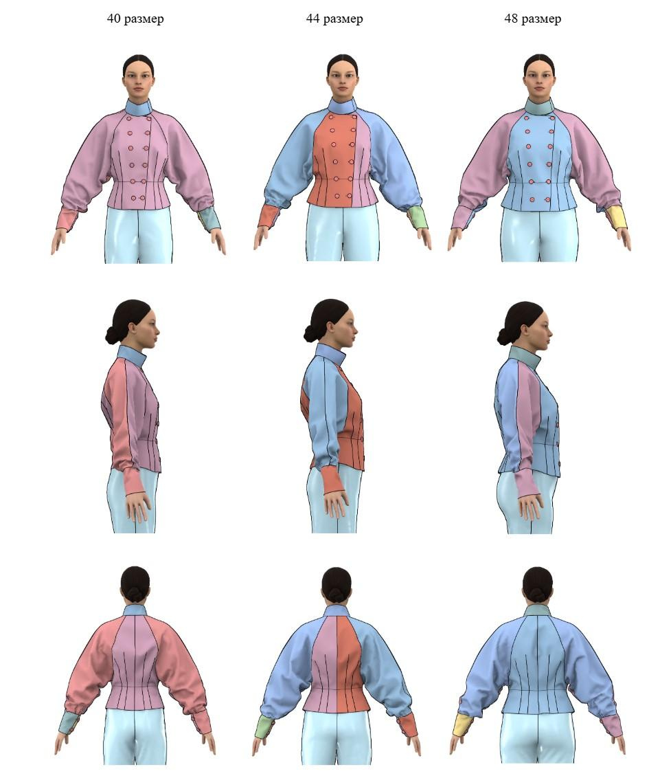 Я оформила комплект лекал на базовый размеро-рост, произвела градацию на четыре размера и провела итоговую примерку в Clo3D. Кроме того, был отшит образец изделия для передачи на производство.