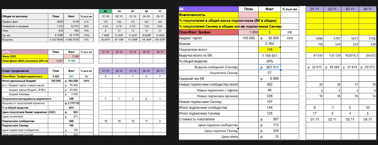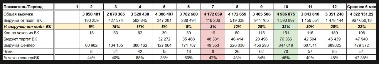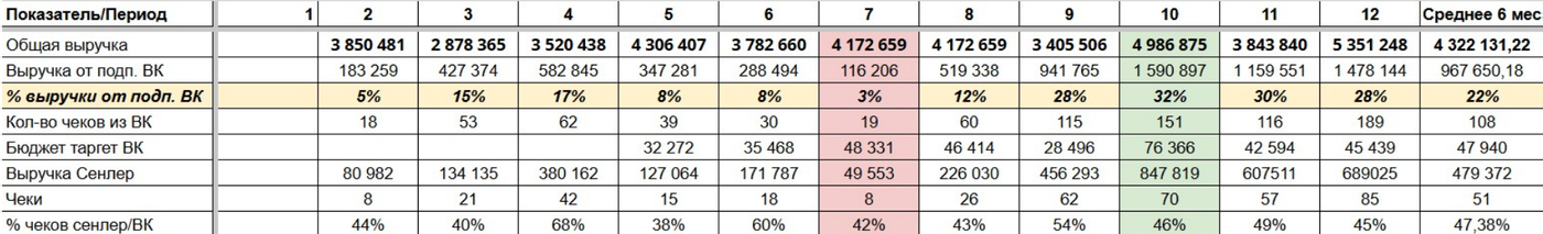 Одним из самых сложных оказалось отследить эффективность во ВКонтакте при отсутствии CRM. Благодаря Моему бизнесу, Senler, TargetHunter и сложным формулам в Exel нам удалось свести ФИО клиентов и их чеки с ФИО подписчиков в ВК и отследить объем продаж. Да, погрешность есть, но даже с ее учетом мы увидели большое поле для анализа и докрутки.